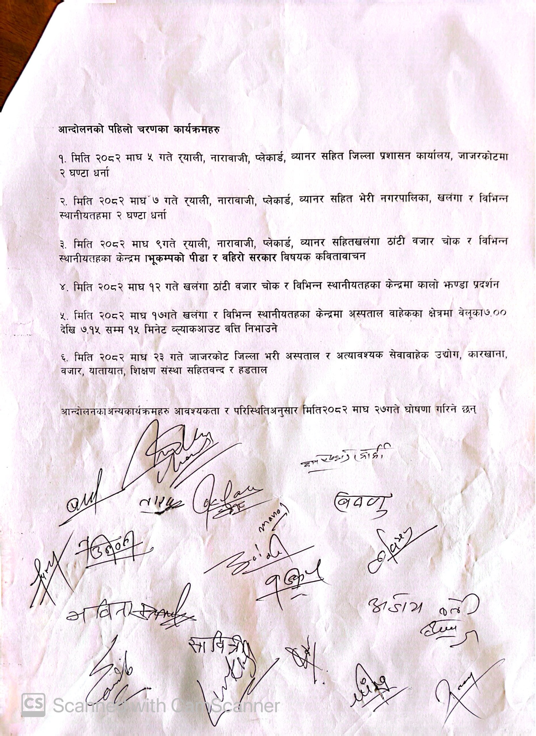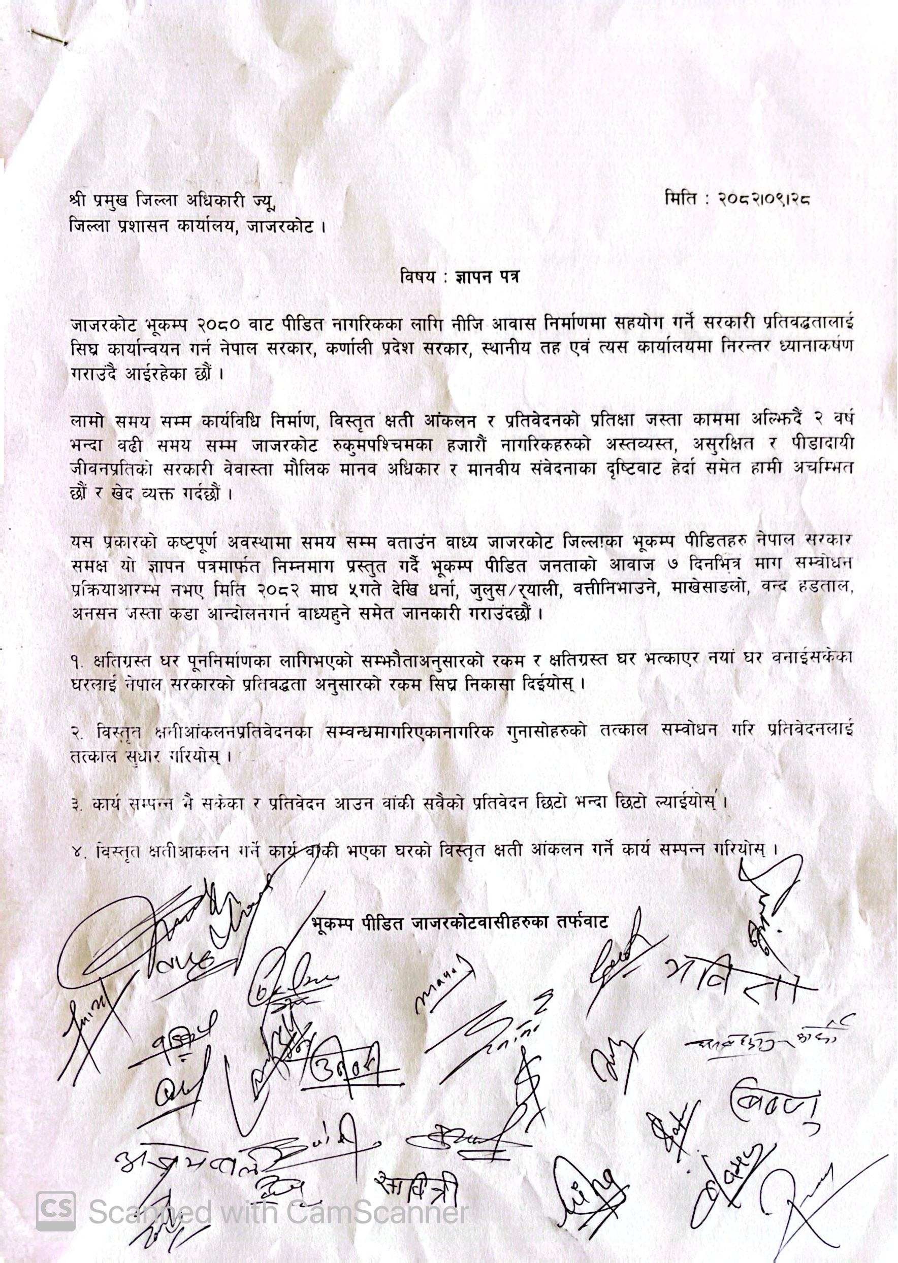 भूकम्प पीडित जाजरकोटवासीहरूको तर्फबाट जिल्ला प्रशासन कार्यालय जाजरकोटमार्फत प्रमुख जिल्ला अधिकारीलाई बुझाइएको ज्ञापनपत्रमा नेपाल सरकार, कर्णाली प्रदेश सरकार तथा स्थानीय तहले गरेका प्रतिबद्धता तत्काल कार्यान्वयन गर्न माग गरिएको छ।